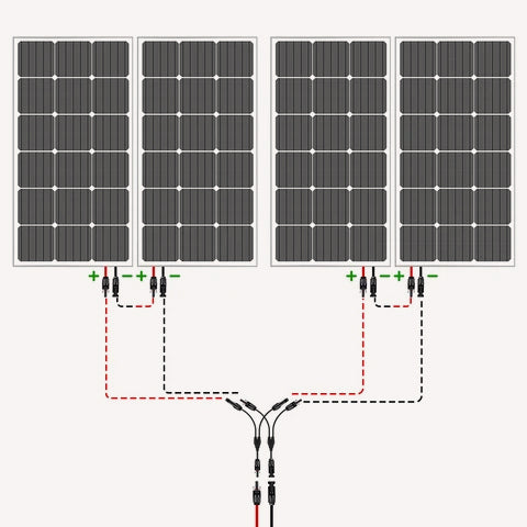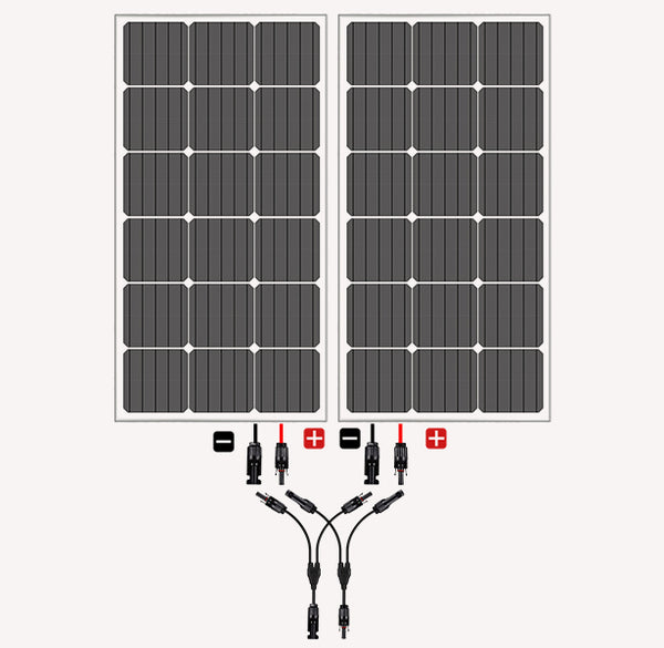 When wiring panels in parallel, hook up the positive or negative wire from one panel to the positive or negative wire of the next panel, and so on. In parallel connection method, you connect the wires with the same sign between panels. Y branch connectors are necessary for the parallel connections. On the contrary to series connection, the voltage values are not added up and stay the same no matter how many panels you connect in parallel, and the amperage values of each panel are added up together.