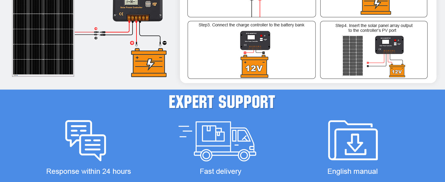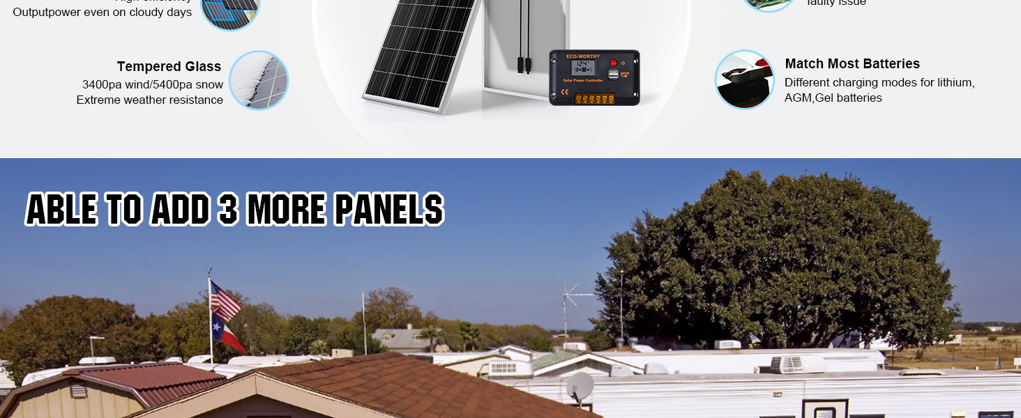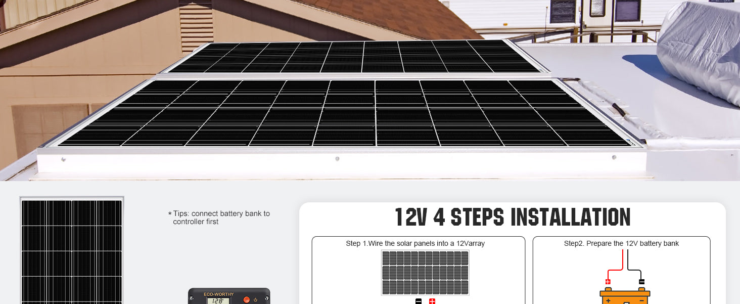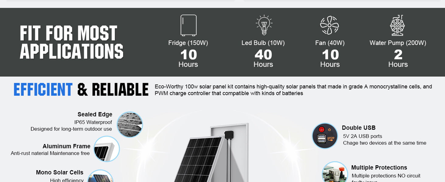 ECO-WORTHY 100W 200W 12V Solar Kit can be used for several different purposes, including boats, RVs, Campers, etc. Whatever the kit is used for, you can rest assured that you are purchasing a quality system. Run a small stereo, laptop computer, cell phone charger, lights or TV. These size systems need conscious conservation of energy. If you have any questions regarding this product, please contact us info@eco-worthy.com.