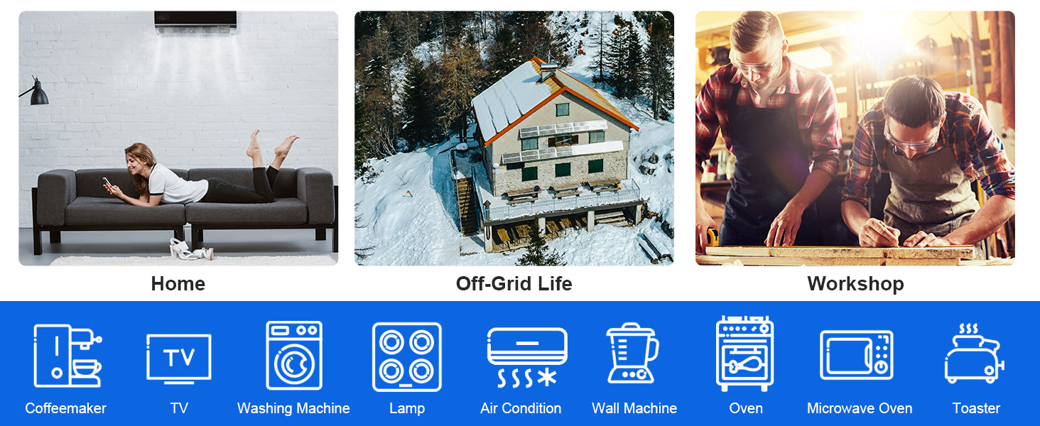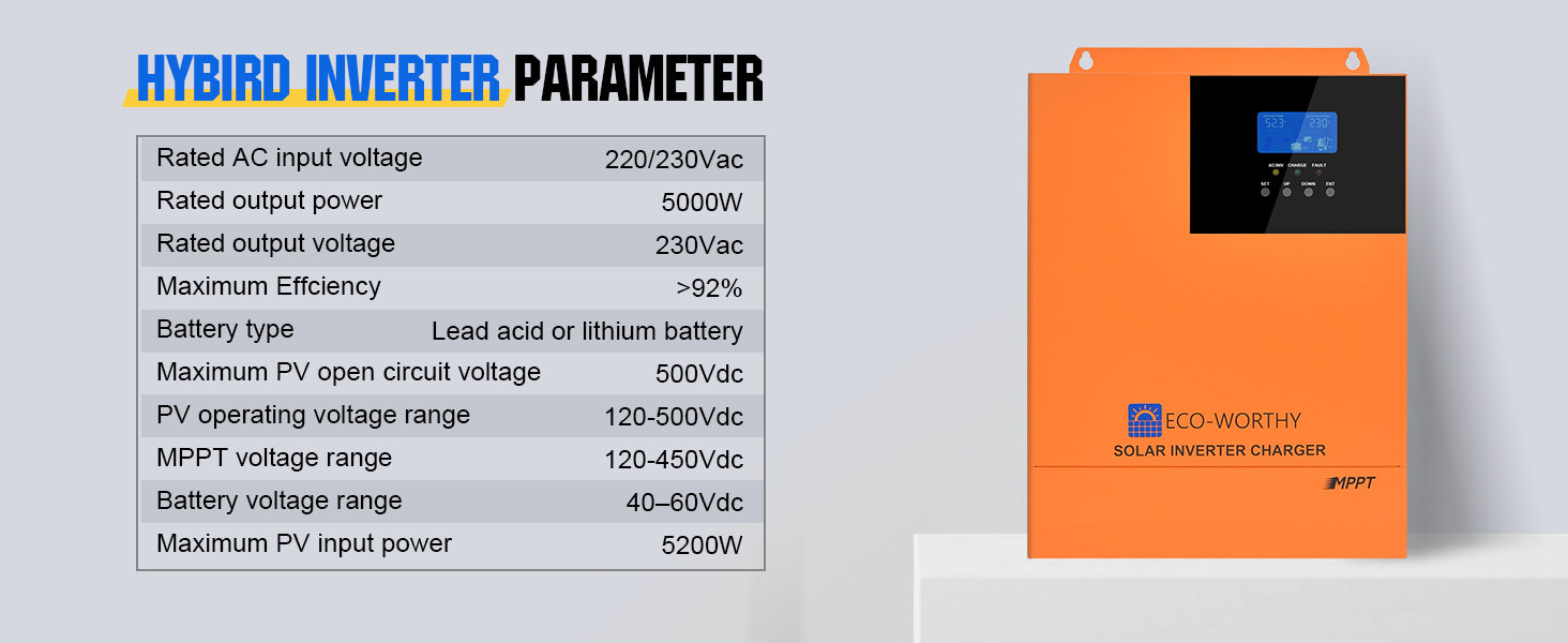 ·Applications: It's able to obtain electricity from 120-500V DC solar panel array, 50/60HZ generator and 220/230V AC mains. 5000W (10000VA in peak) power supply to air conditioner, coffeemaker, fridge and more. The package contains 5000W all-in-one solar hybrid inverter + WiFi modules.