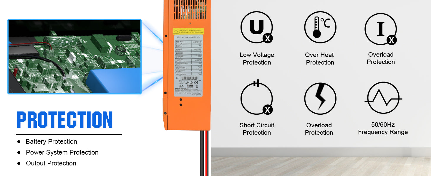 ·Battery Charging: Compatible with most batteries, such as Lead-Acid, AGM, NCM, Flooded, Lithium batteries. Charge the 48v battery group with bulk and floating states(hybrid inverter can only works when 48v battery bank connected).