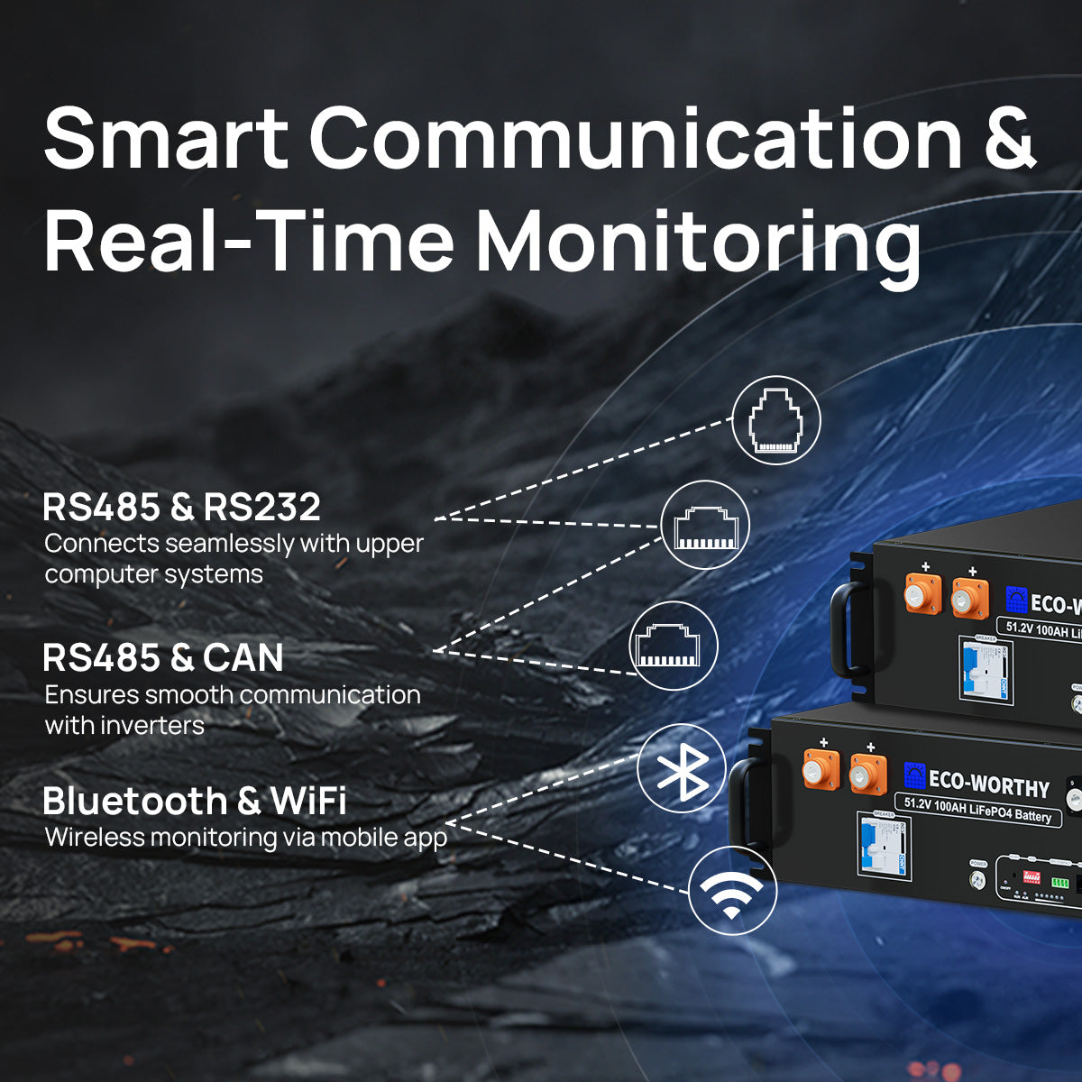 2. Smart Monitoring, Anytime – Stay in control with real-time voltage, current, SOC, and capacity tracking via the Eco-Worthy app (Bluetooth/WiFi). Equipped with RS485, RS232, and CAN interfaces for seamless integration with leading hybrid inverters such as Victron and Growatt.
