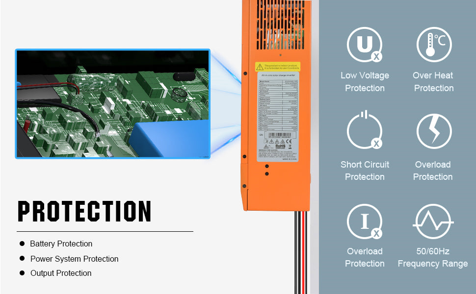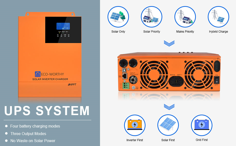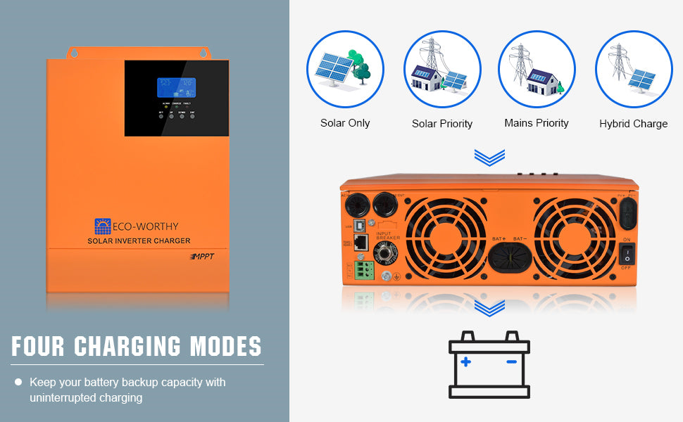 ·Multiple Modes: Two output modes: mains bypass and inverter output; uninterrupted power supply. Available in 4 charging modes: Only Solar, Mains Priority, Solar Priority and Mains & Solar hybrid charging.