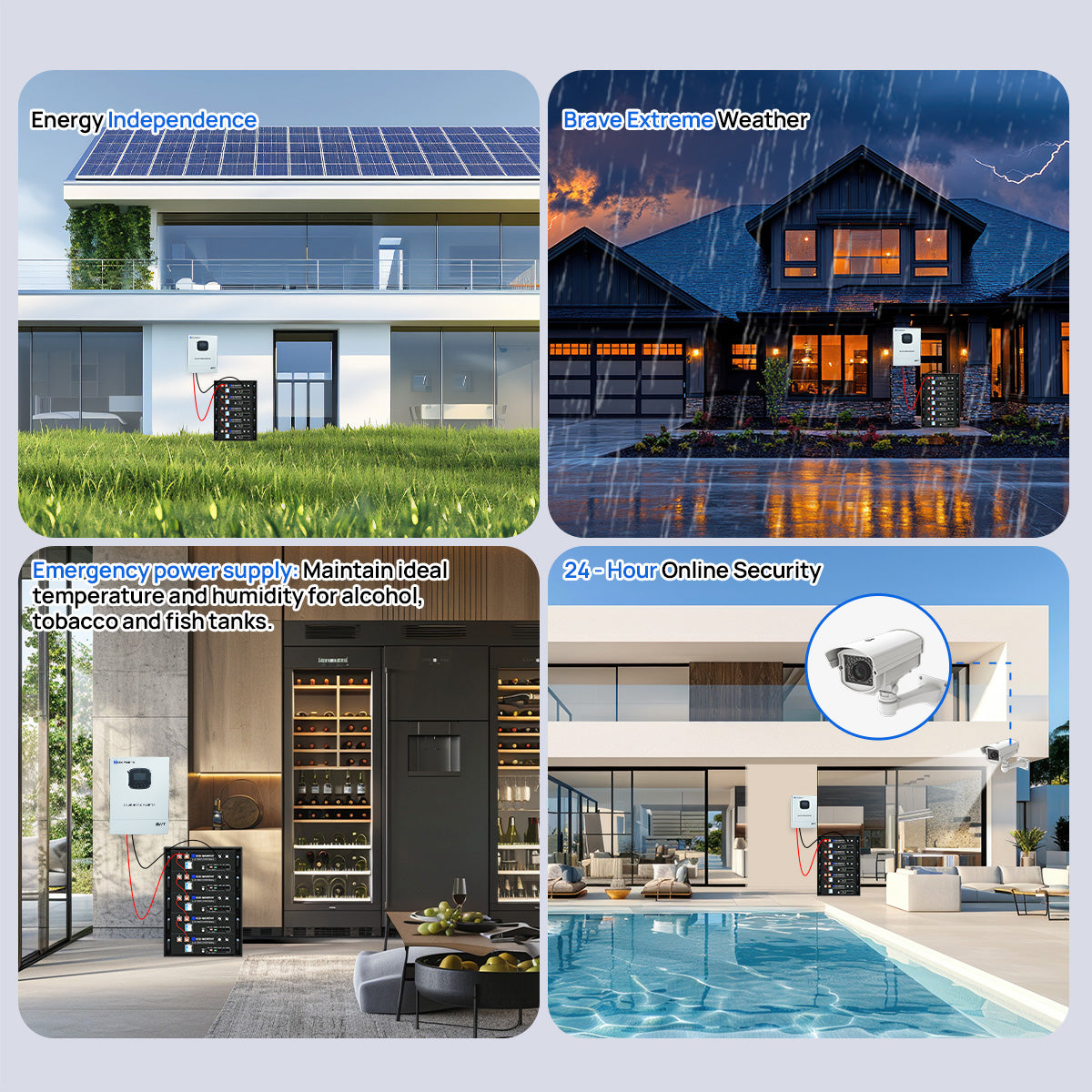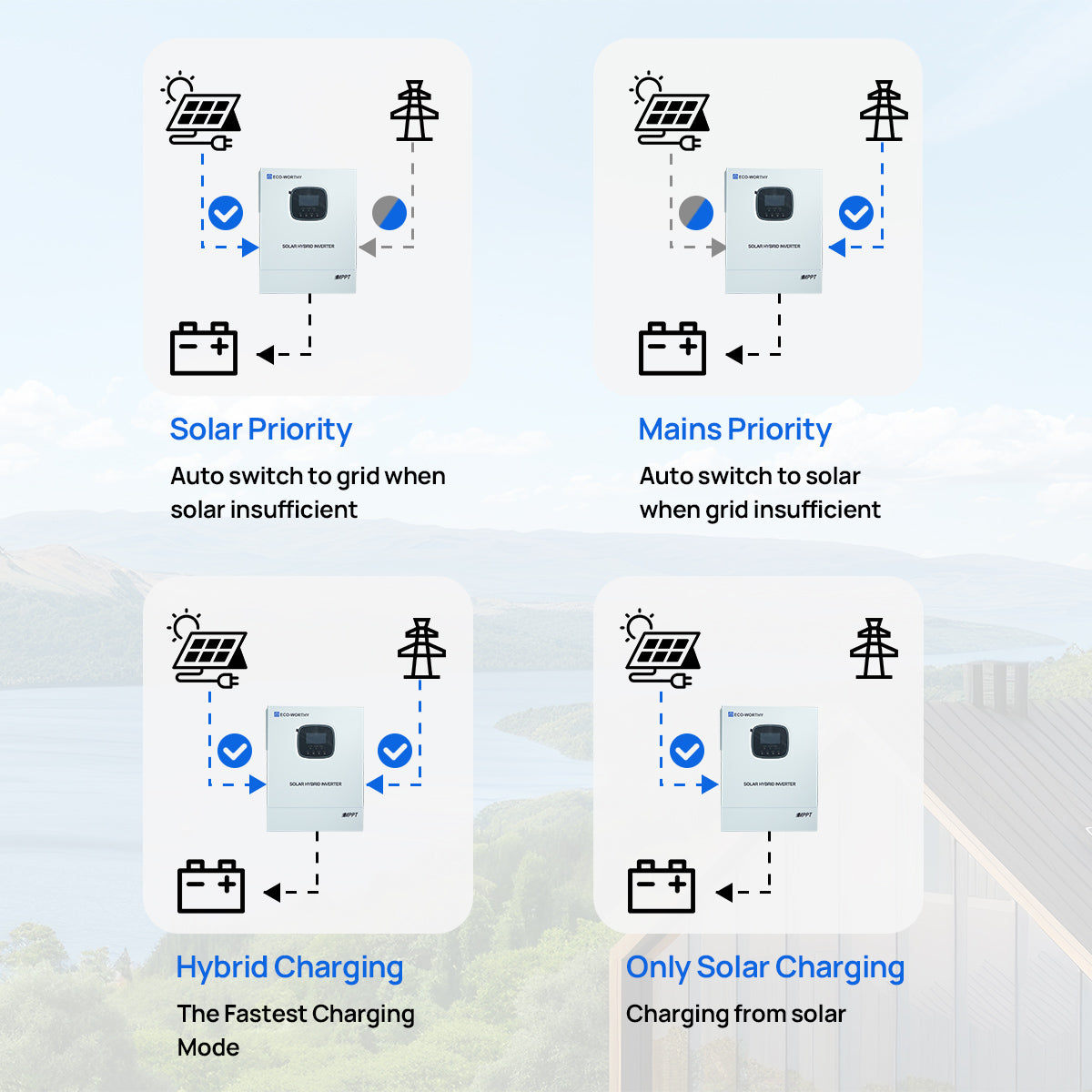 [UPS Automatic Switching] Built-in UPS capability ensures seamless switch to battery power during grid outages. Prioritize between grid and inverter modes to maintain uninterrupted power for your home.