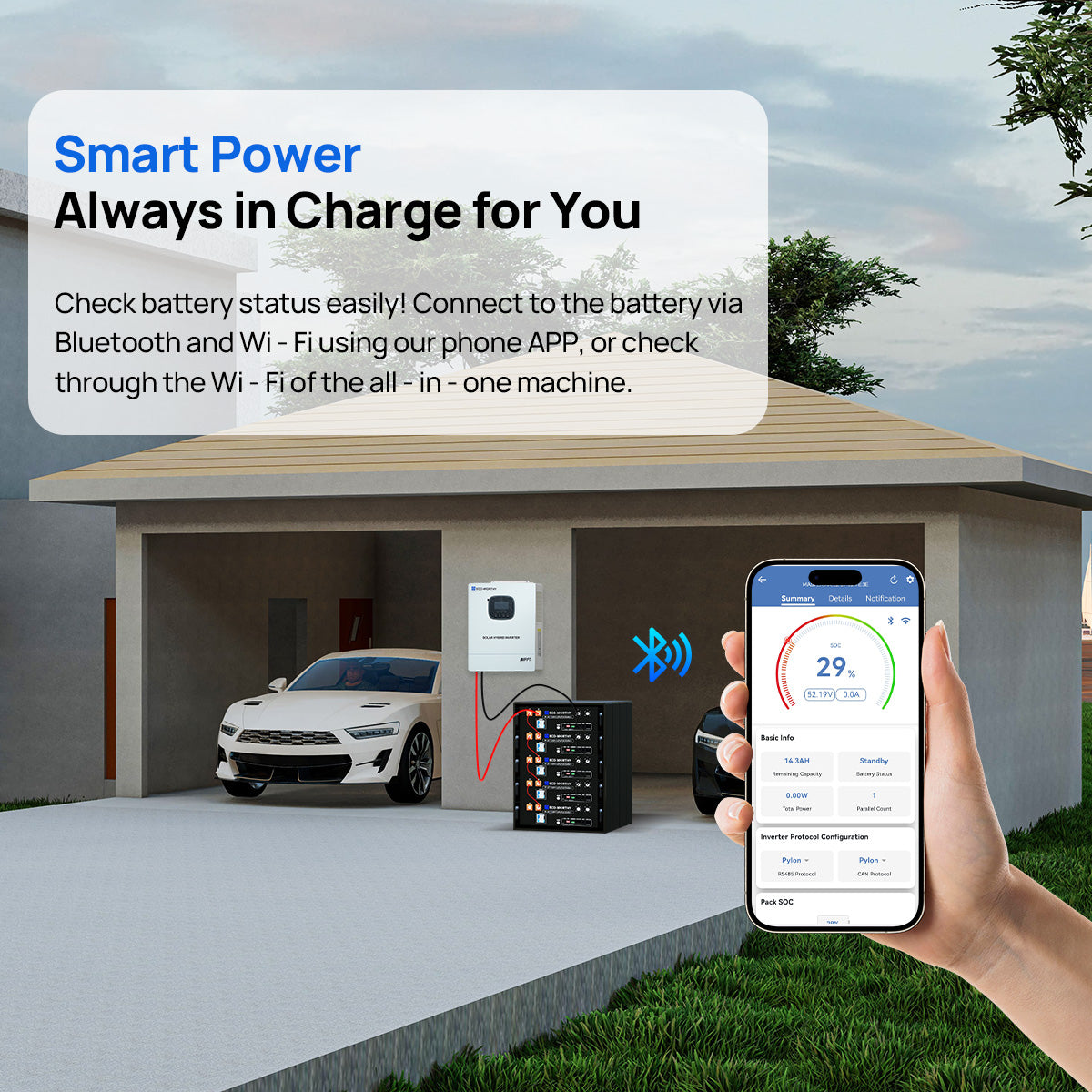 [Integrated Communication Batteries] Each 48V 100Ah LiFePO4 battery features Grade A cells, CAN/RS485 communication, Bluetooth & WiFi monitoring. Equipped with a 100A BMS and 125A air switch for advanced safety. Optional 3U rack-mount version available.