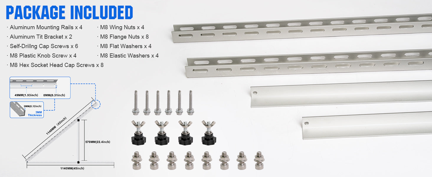 ·Improve Adaptability: The newly upgraded ECO bracket can accommodate solar panel arrays ranging from 100W to 400W or panels with a width of approximately 45 inches.This bracket is suitable for all ECO-WORTHY solar panels.