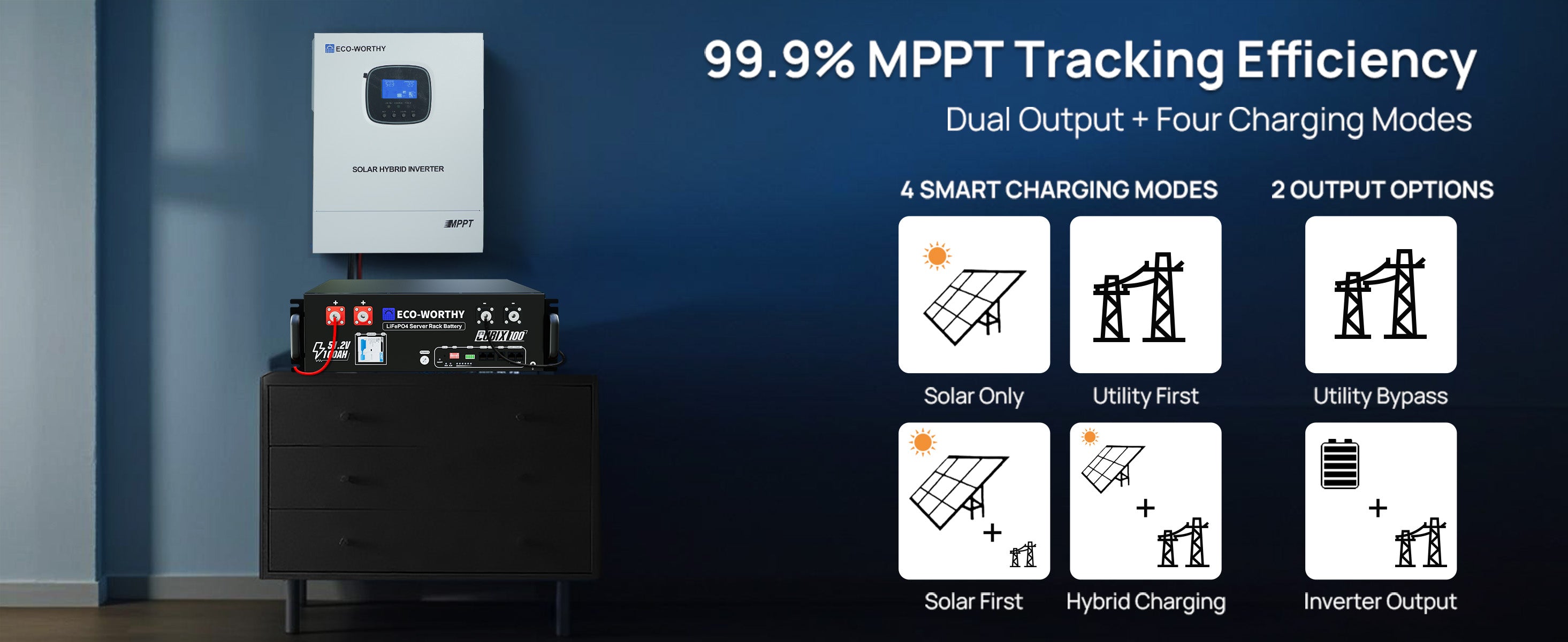 [Upgraded 48V 3000W Pure Sine Wave Hybrid Inverter] Eco-Worthy’s 3000W inverter delivers pure sine wave output from 48V DC to 220V/230V AC, with a peak power of 6000W. Equipped with advanced MPPT technology (99.9% efficiency) and wide MPPT voltage range, it ensures optimal solar charging. The inverter features dual digital closed-loop control and SPWM technology for clean, stable power—safe for sensitive electronics. Its energy-saving mode minimises standby losses, improving overall system performance.