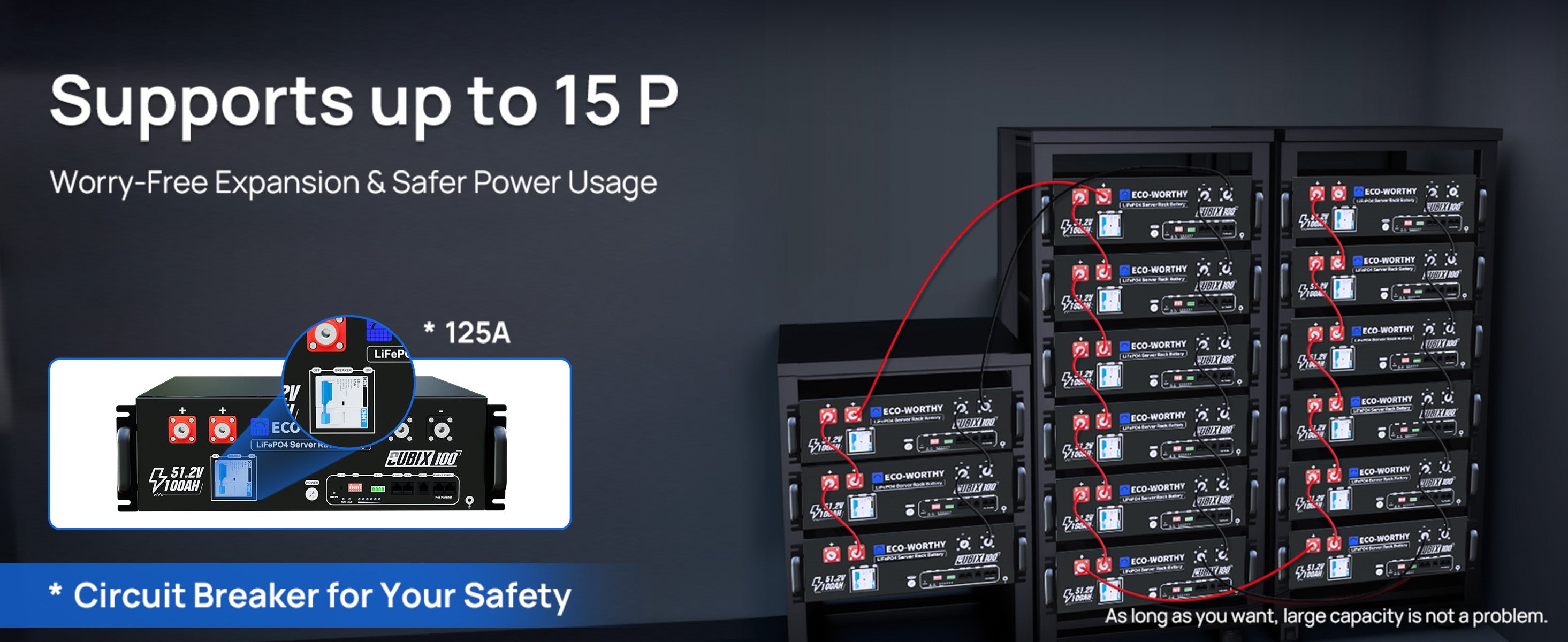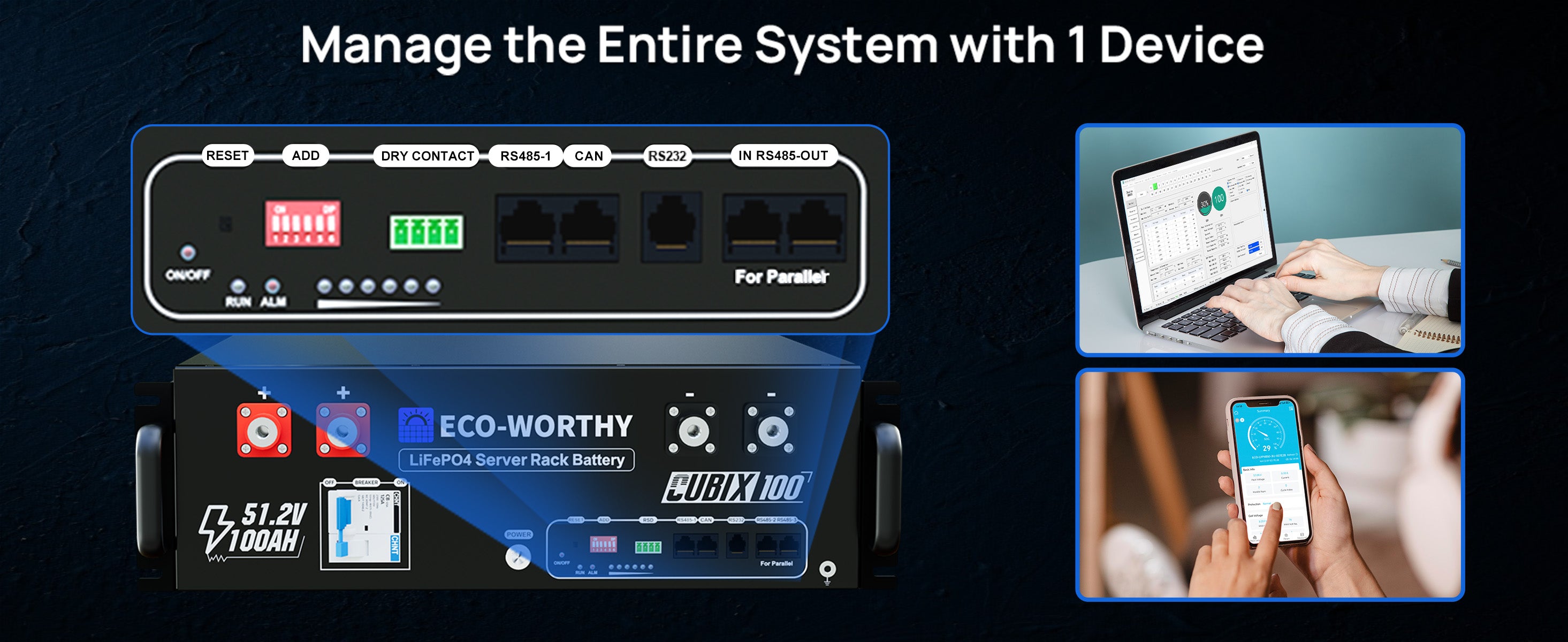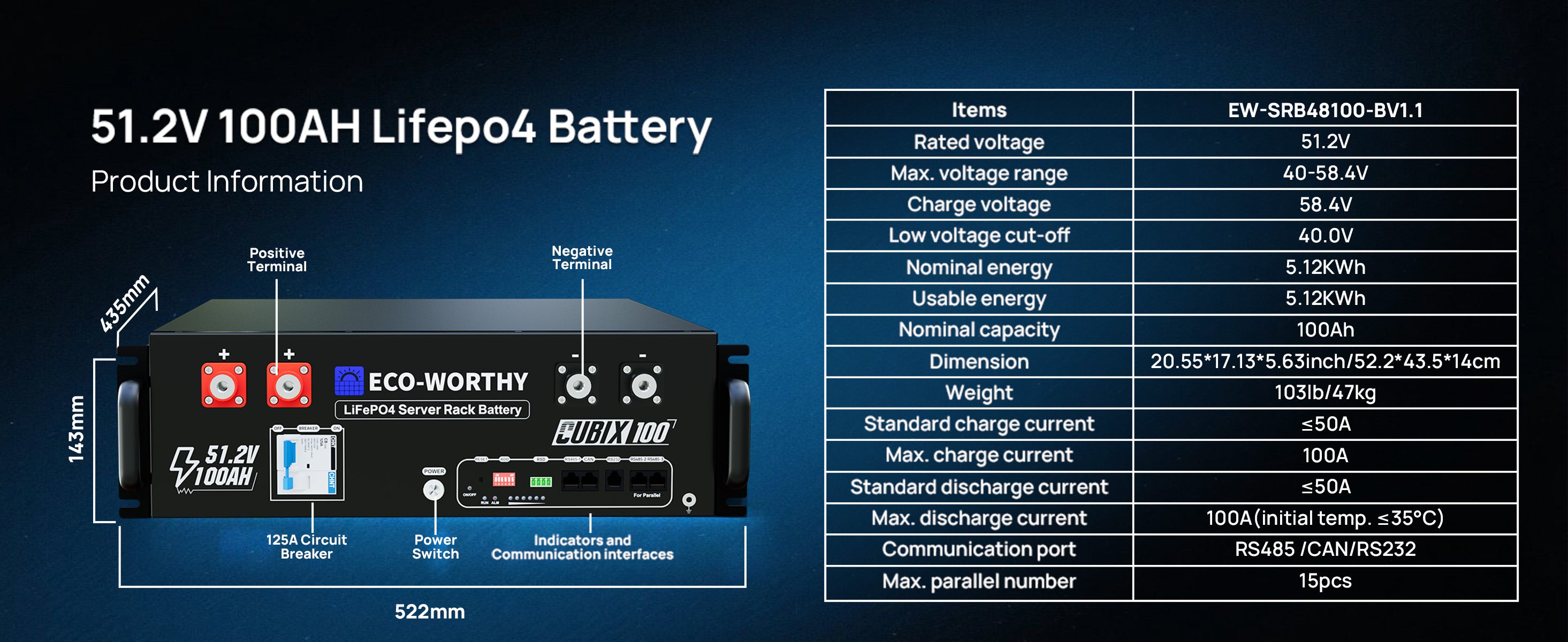 [Smart Battery Monitoring & Wide Compatibility] The Cubix 100 48V 100Ah Server Rack Battery supports CAN and RS485 communication, ensuring compatibility with mainstream hybrid inverters. Monitor real-time battery status via a mobile app using Bluetooth or WiFi. Its compact 3U rack-mount design saves space and makes installation easier in home or commercial setups.