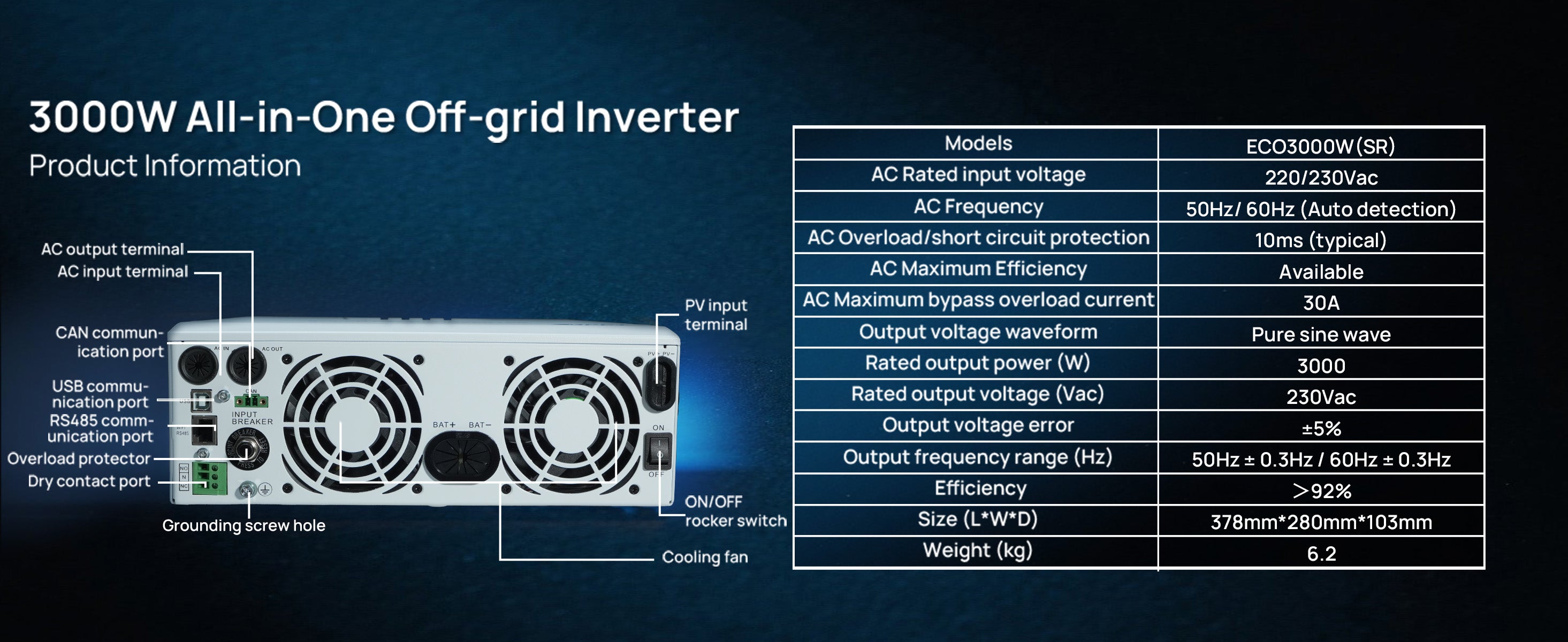 3000W Pure Sine Wave Inverter provides high-quality AC power equivalent to grid power to protect your household appliances and electronic equipment, especially suitable for sensitive electrical appliances.