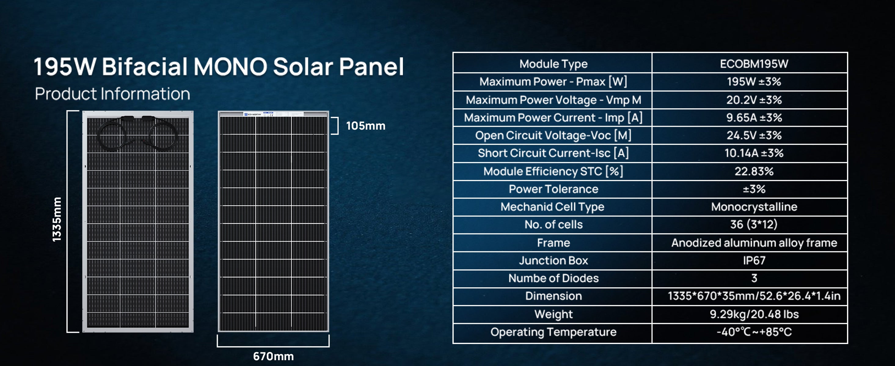 [195W High-Efficiency Bifacial Solar Panels] Each panel features a 12BB cell design with a transparent backsheet and 91.5% light transmittance, offering a 23% conversion rate. Under ideal conditions, one panel can generate up to 858Wh per day. For best rear-side output, pair them with ECO-WORTHY's solar tracking or adjustable tilt mounting brackets.