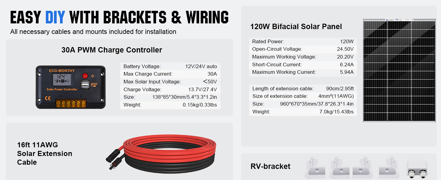120W 240W 12V (1/2x Bifacial 120W) Off Grid Solar Kit with RV Mounting Brackets