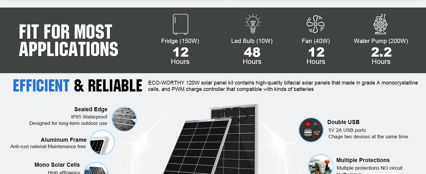 ECO-WORTHY 120W 240W 12V Solar Kit can be used for several different purposes, including boats, RVs, Campers, etc. Whatever the kit is used for, you can rest assured that you are purchasing a quality system. Run a small stereo, laptop computer, cell phone charger, lights or TV. These size systems need conscious conservation of energy. If you have any questions regarding this product, please contact us info@eco-worthy.com.