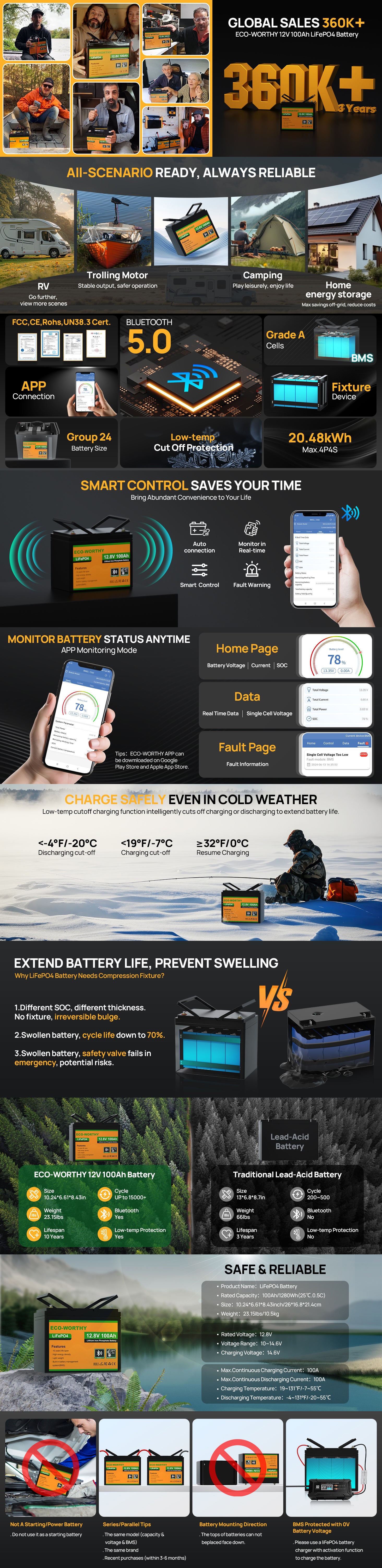 [100A BMS & Grade-A Cells] – UL/IEC tested, CE/RoHS certified. Protects against overcharge, discharge, overcurrent, overheating, low temp, and short circuit.