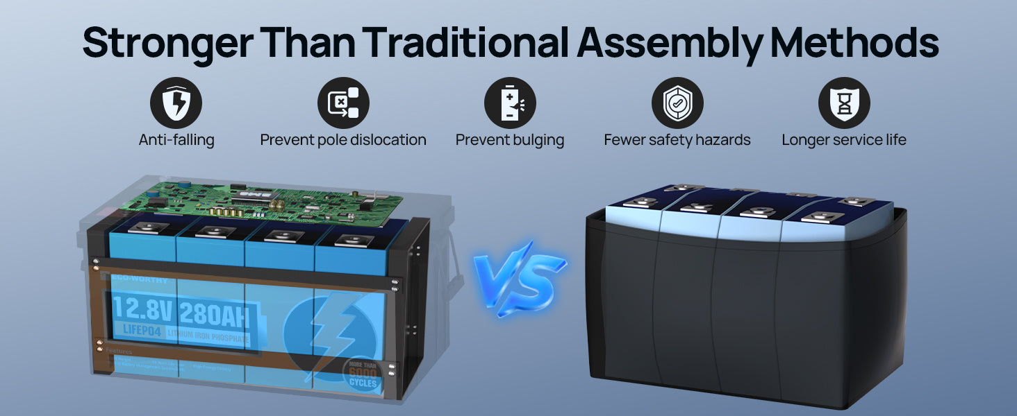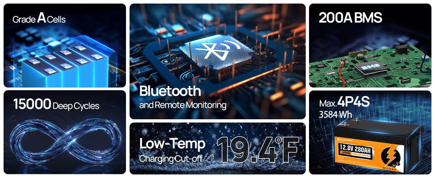 [Advanced 200A BMS Safety] – Built-in Battery Management System provides complete protection against overcharge, over-discharge, overcurrent, overheating, and short circuit. Guarantees safe and stable performance.