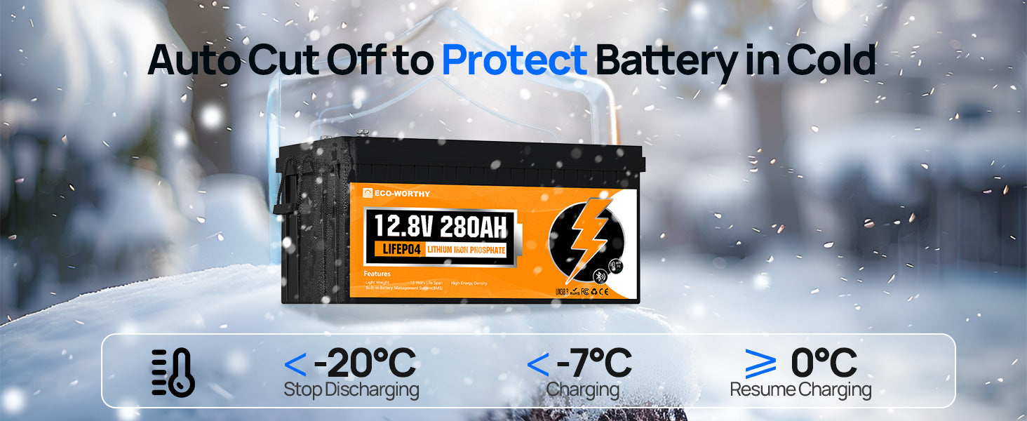 [Low-Temperature Protection Technology] – Automatically stops charging below -7°C (19.4°F) and resumes above 0°C (32°F). Discharge cutoff below -20°C (-4°F) prevents damage in cold weather conditions, ensuring safe year-round use.