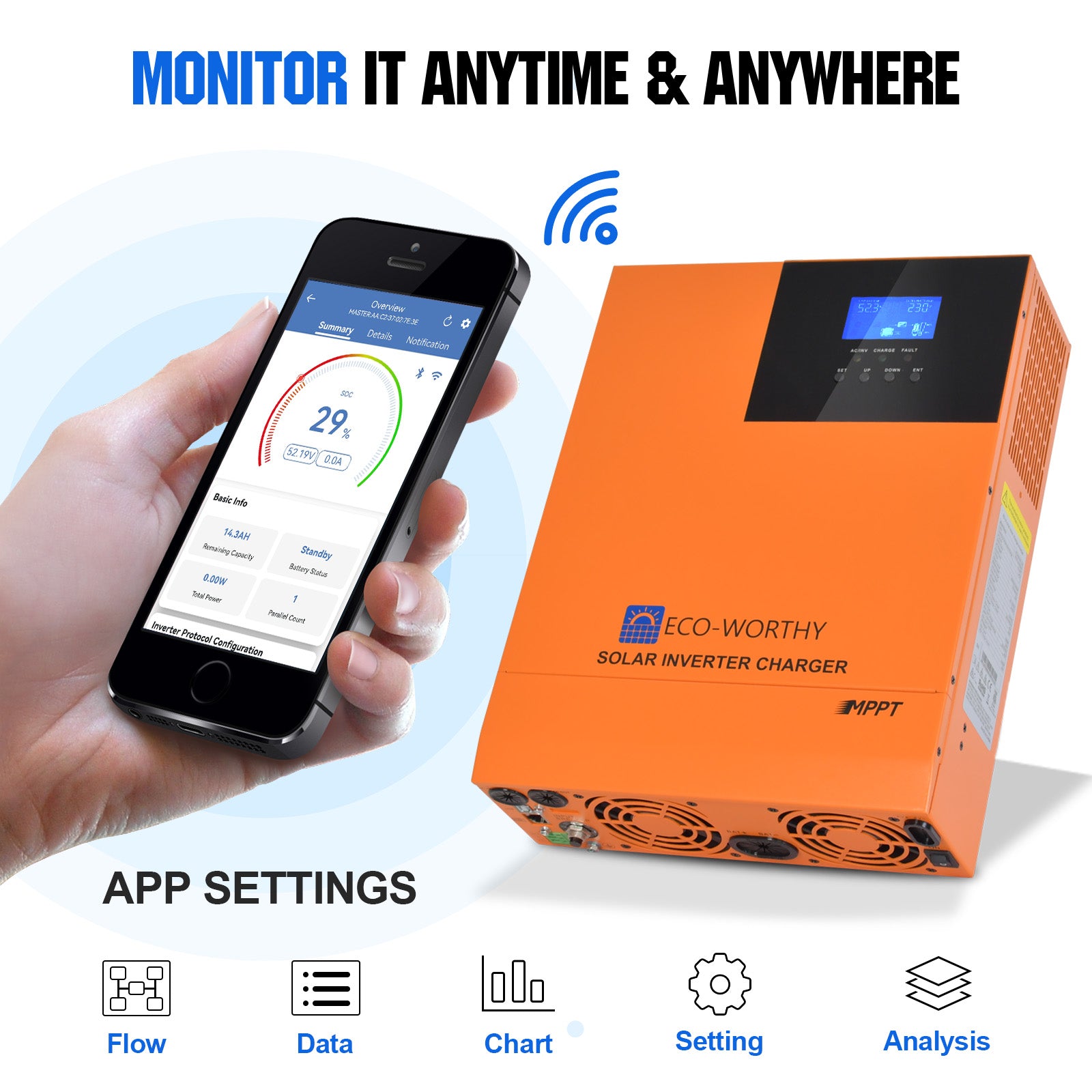 [Compact 5000W MPPT Hybrid Inverter] Integrated with an 80 A MPPT solar charge controller, this 48 V pure sine wave inverter supports solar, grid, or backup generator charging. Delivers intelligent battery management and UPS switching for continuous, stable power .