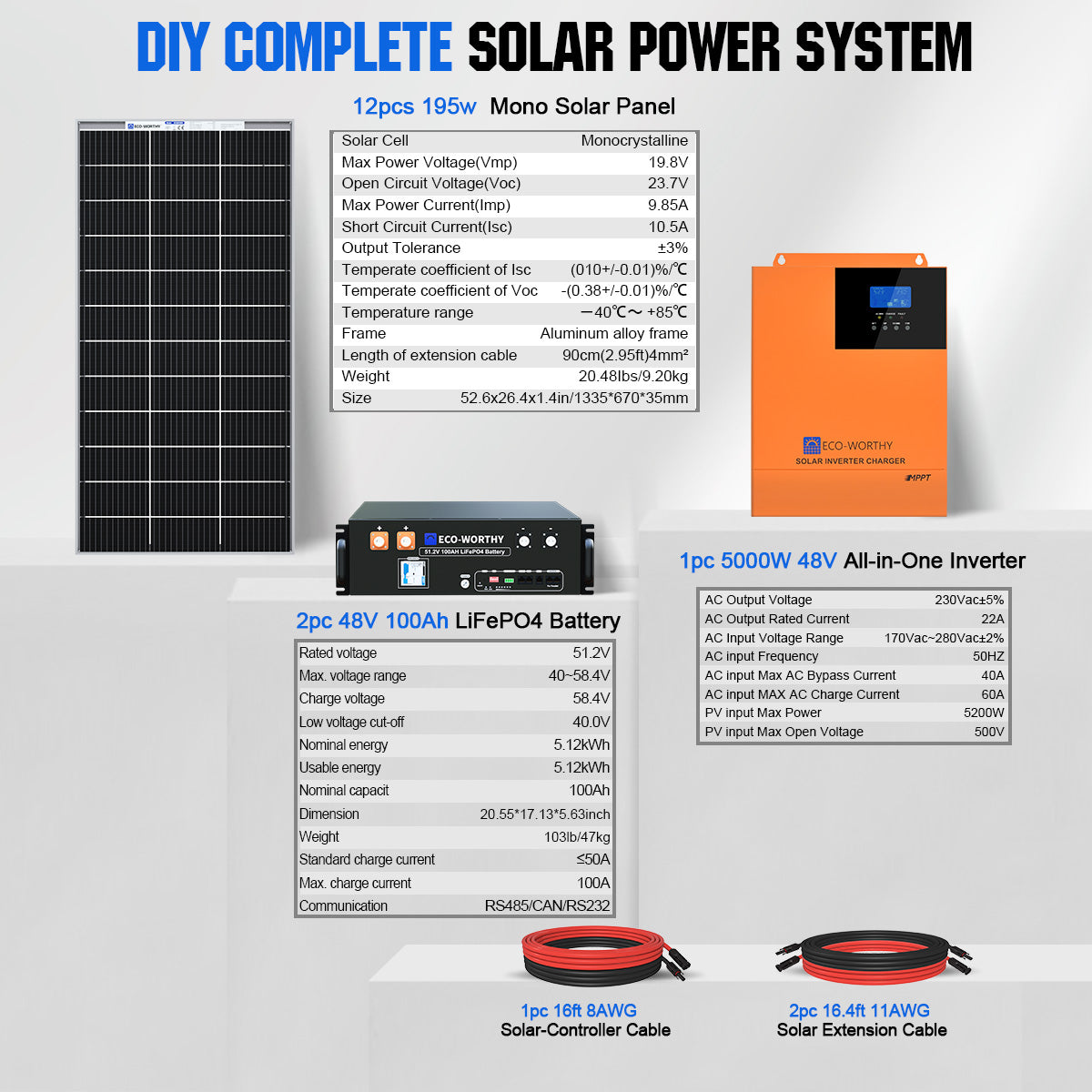 ECO-WORTHY 195 Watt 12V Mono solar panel is backed by 25-year linear power guarantee. ECO-WORTHY LiFePO4 Lithium Iron Phosphate Battery has twice the power, half the weight and lasts 8 times longer than a sealed lead acid battery.