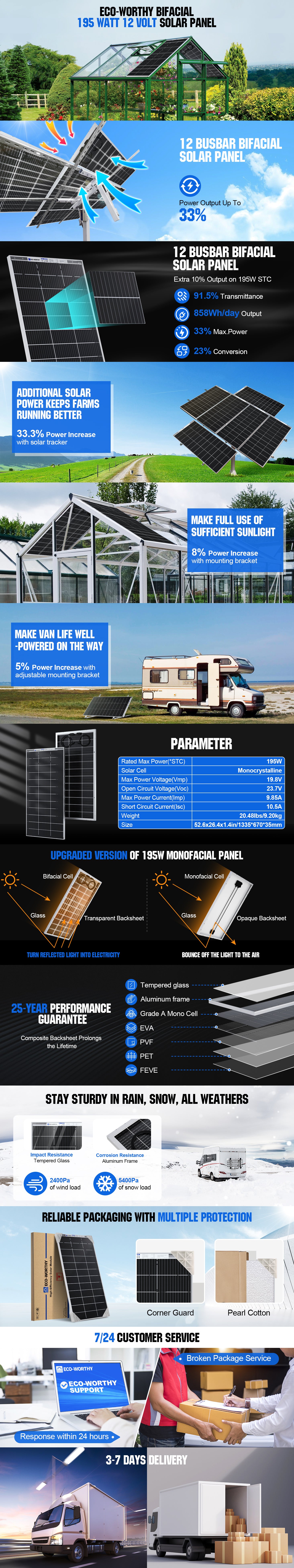 ECO-WORTHY's latest innovative 195W bifacial solar panel is among the best solar panels for marine and RV applications, offering up to 33% higher energy output than traditional solar panels thanks to its bifacial design that captures sunlight from both sides. Featuring premium Grade A+ monocrystalline solar cells, PERC technology, half-cut cells, and bypass diode network, this monocrystalline solar panel ensures high solar cell efficiency and solar panel output. It is a great option that can provide power even in the toughest environmental conditions.