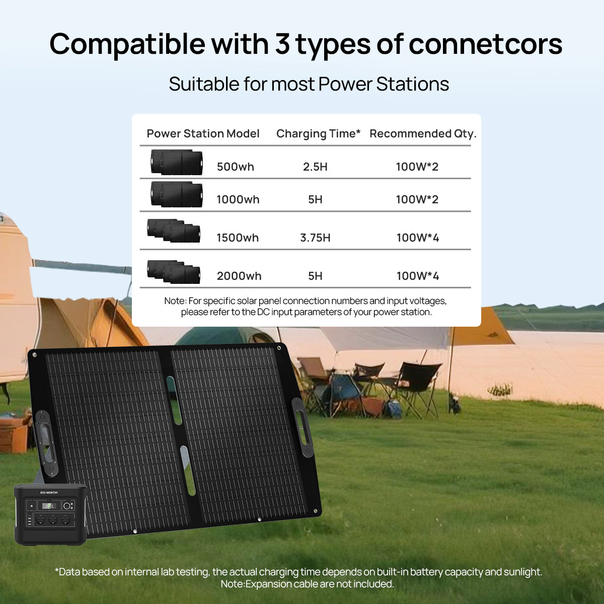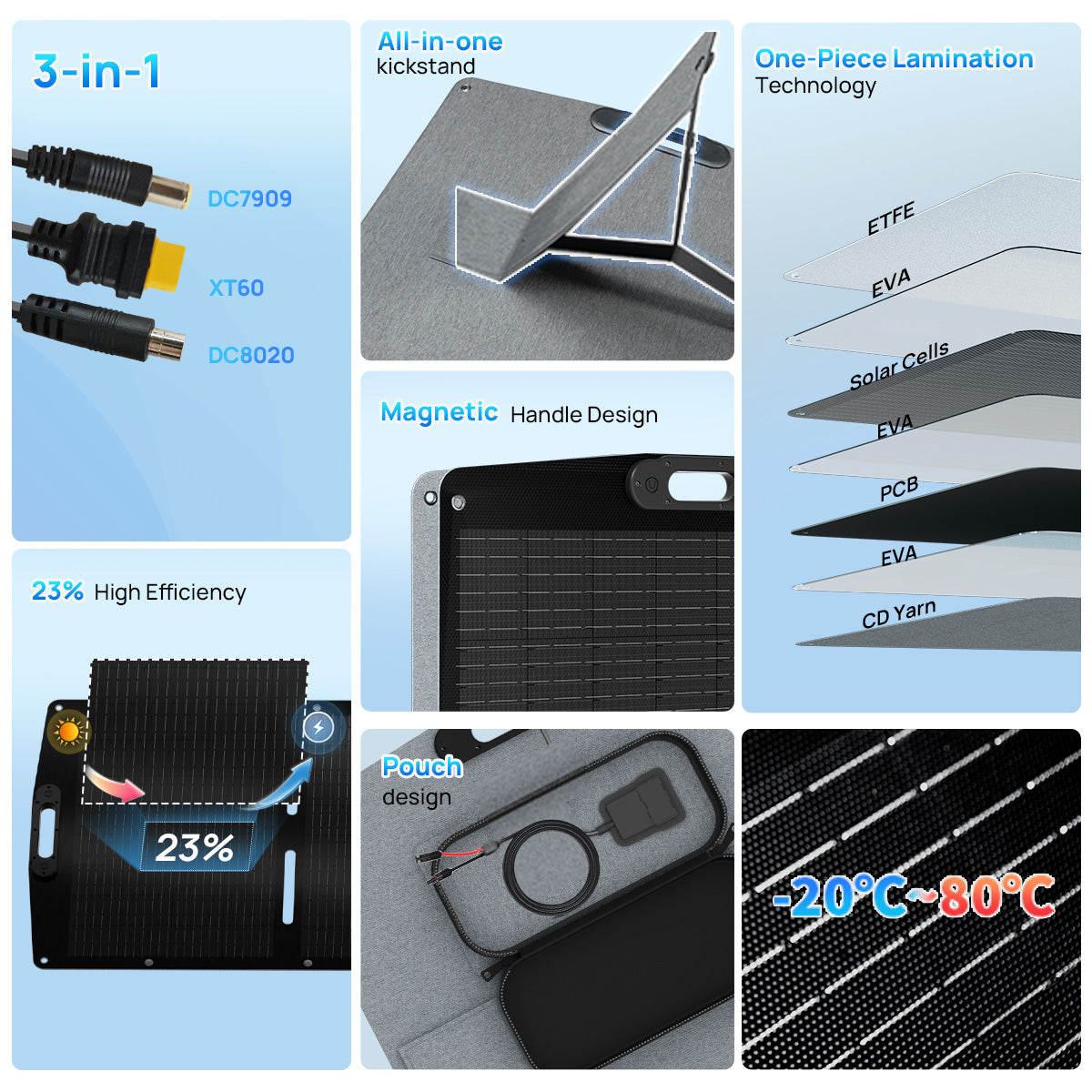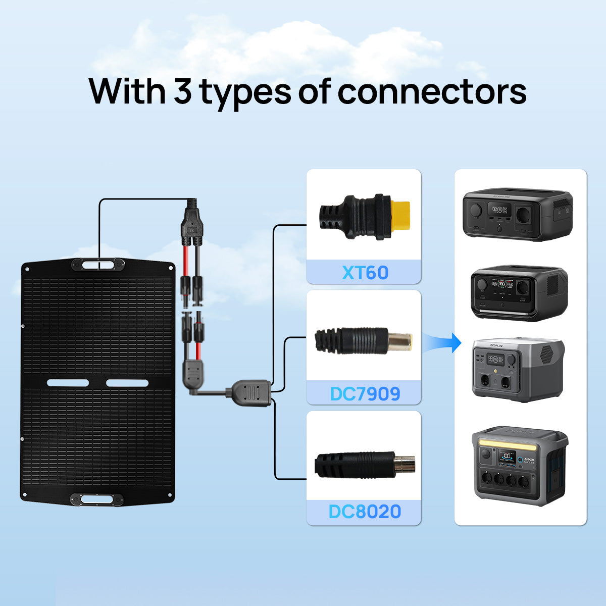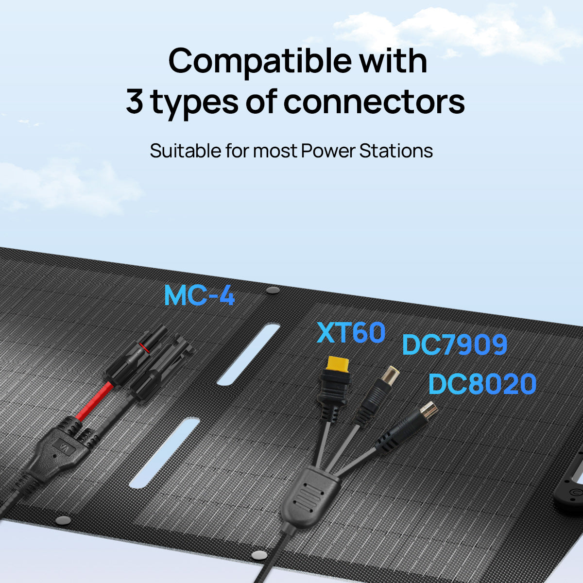 Compatible with Multiple Connectors:‌ Comes with XT60, DC8020, and DC7909 connectors to easily connect most power stations and outdoor devices.