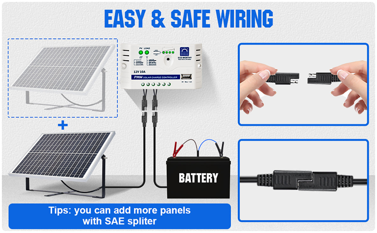 ·Durable Panel: Waterproof 25 Watt solar panel with 9.84ft SAE connector cable, SAE connectors easy to connect and disconnect with controller, plug and play.