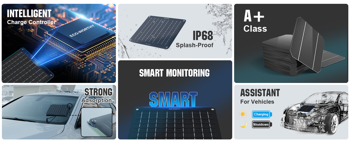 ·Lightweight and Portable: The thickness is only 1/3 of the rigid panel; the weight is light and it is easy to carry. Comes with a SAE cable kit, plug and play, widely used in 12V batteries and DC charging equipment, such as cars, RVs, boats, etc.