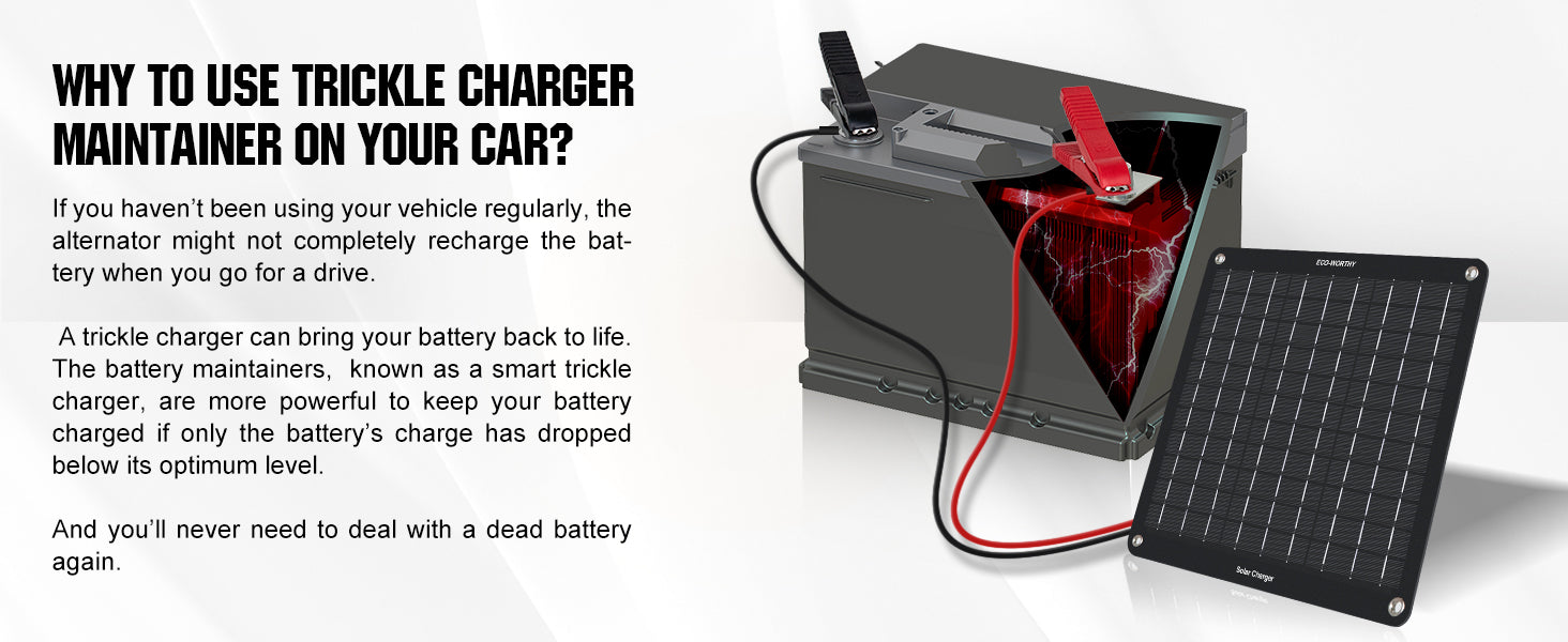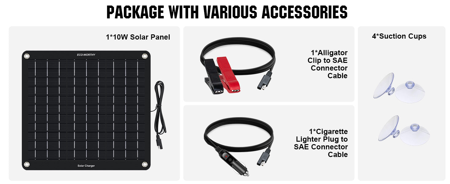 ECO-WORTHY Solar Trickle Charger is the perfect solution for charging the batteries of boats, SUVs, RVs, electric fences, accessory batteries, and much more. Over time batteries naturally lose power and even can go flat. ECO-WORTHY Solar Trickle Charger will help you maintain a healthy battery by converting solar energy into a usable 12V DC current to keep your battery topped off at a stable level.