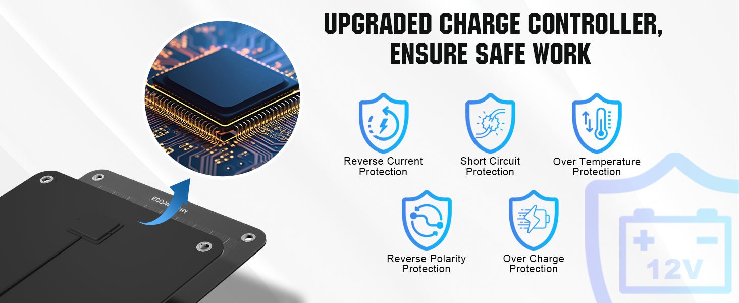 ·Built-in Blocking Diode: The charging algorithm is upgraded, and the charging efficiency is increased by 20%-30%. Provides multiple protections such as overcharge protection, over discharge protection, reverse polarity protection, etc.