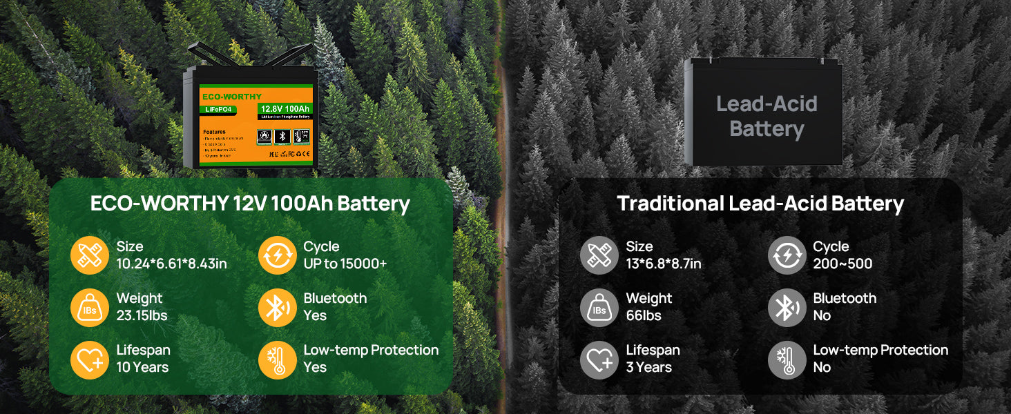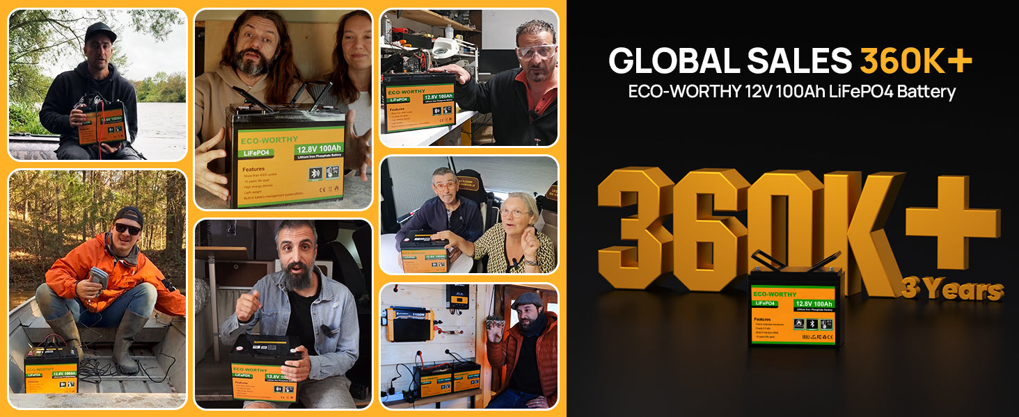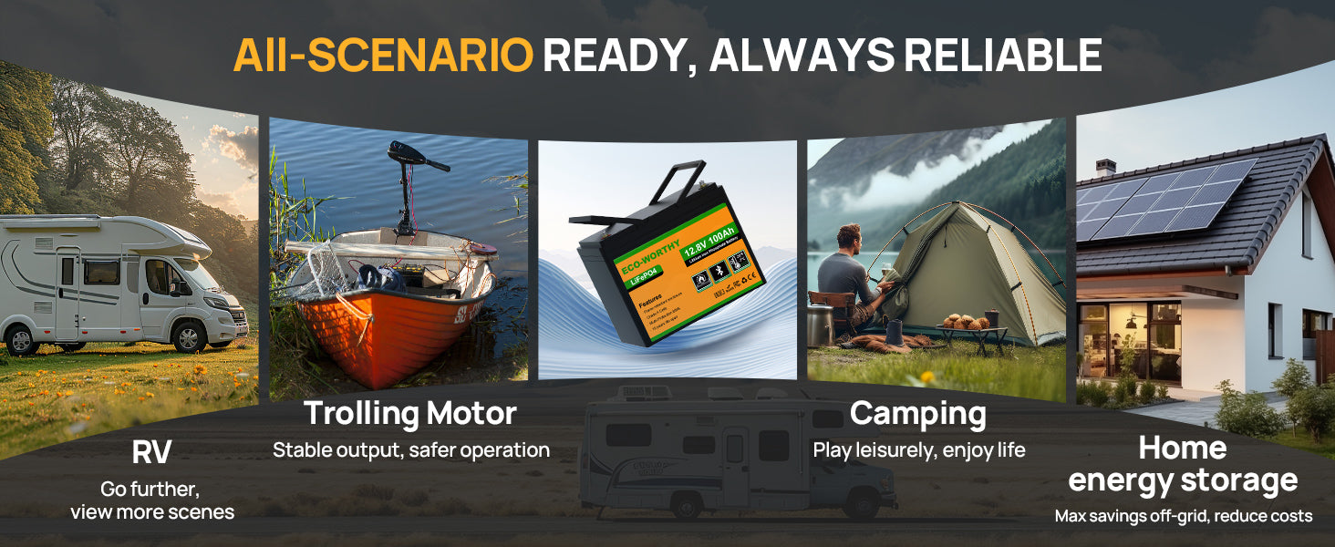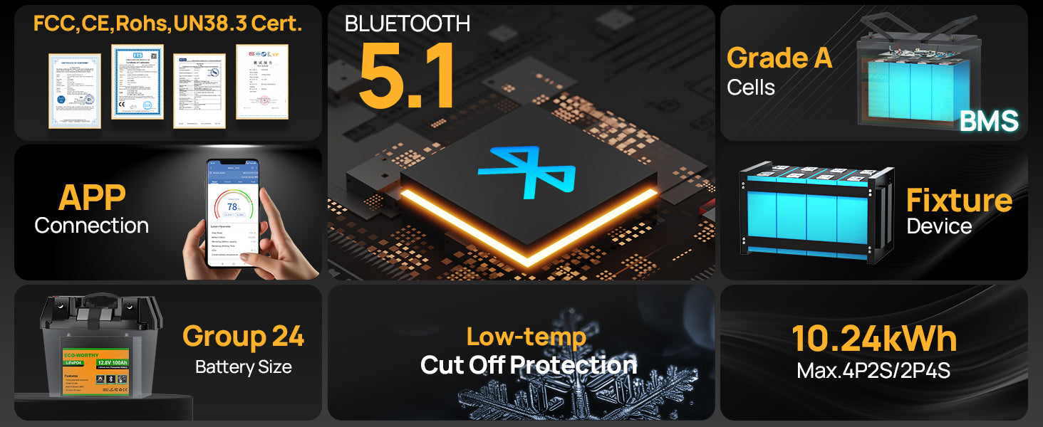[100A BMS & Grade-A Cells] – UL/IEC tested, CE/RoHS certified. Protects against overcharge, discharge, overcurrent, overheating, low temp, and short circuit.