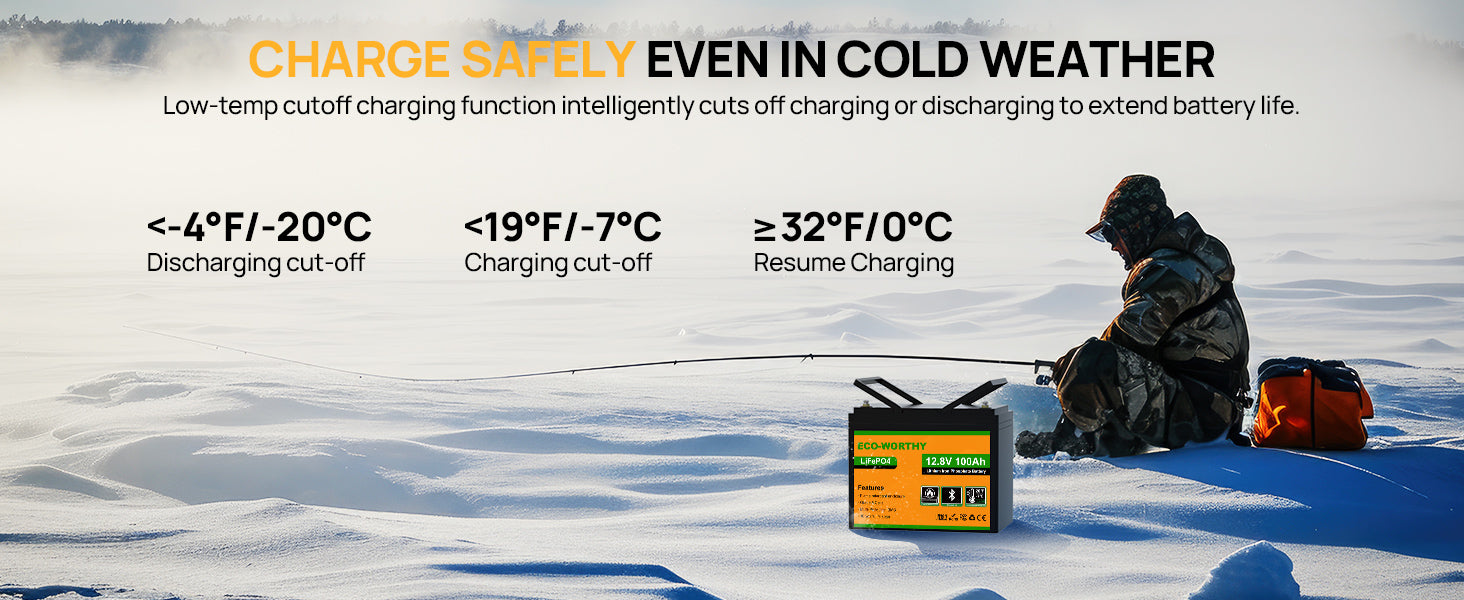 [Low-Temp Safe] – Auto cut-off below -7°C protects cells. Perfect for winter use in RVs, cabins, or marine applications.