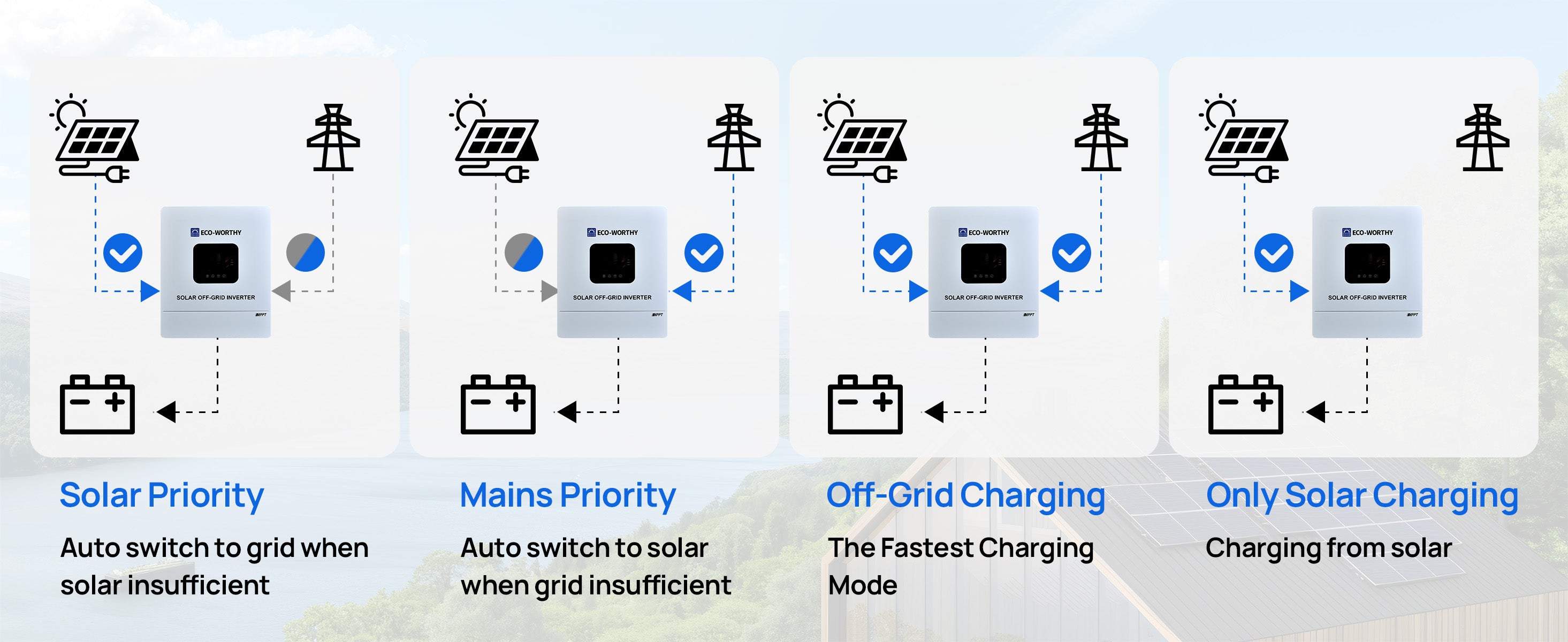 · Wide AC Input Compatibility: Supports 220/230VAC with an ultra-wide 90–280VAC input range. Works reliably with unstable grids or generators, overall efficiency >92%, with built-in circuit breaker protection.