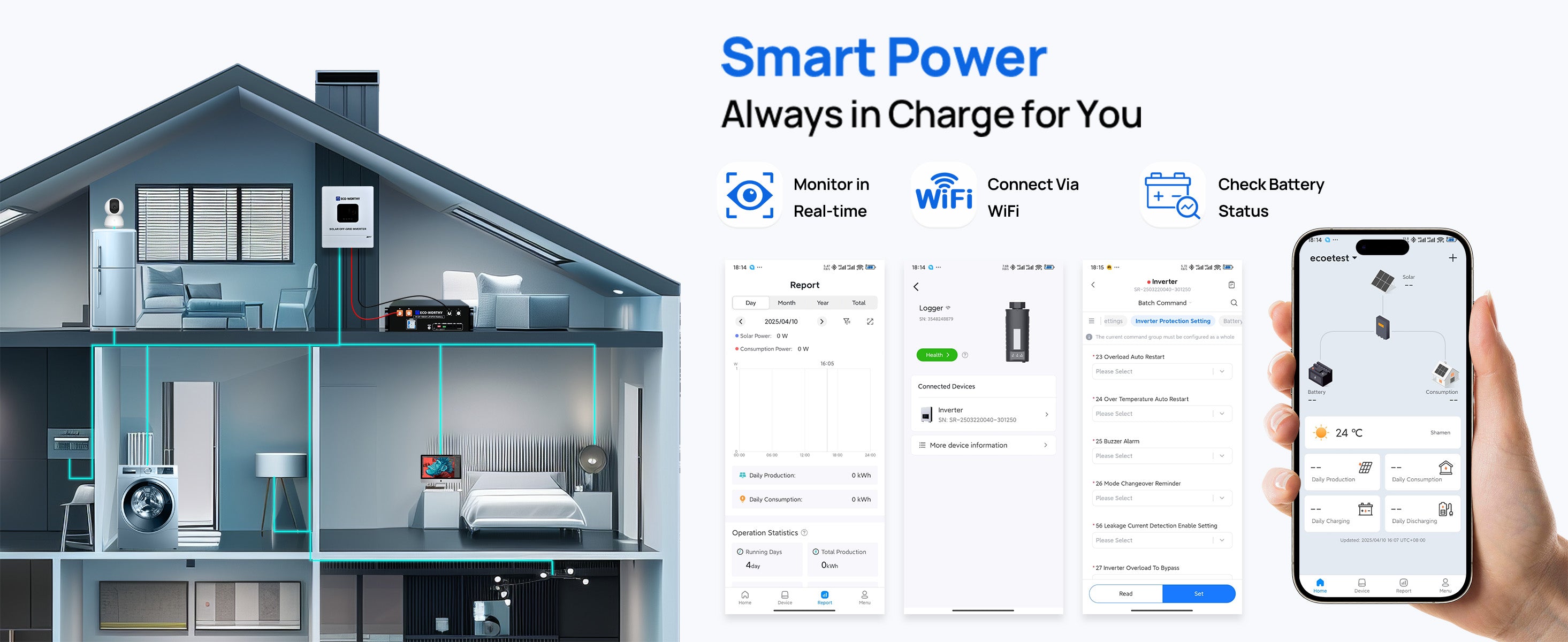 · Smart Control & Full Protection: LCD display with real-time system status. Supports USB / RS485 / WiFi / GPRS monitoring, time-of-use scheduling, power-saving mode, and CE certified safety protections.