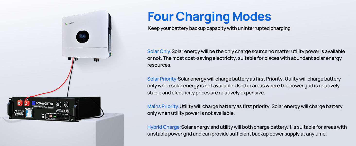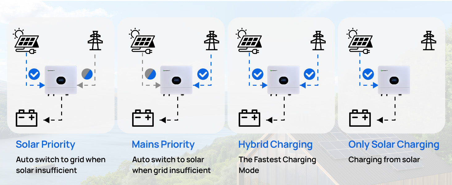 [UPS & Automatic Switching] – Seamless backup during outages, prioritise grid or inverter mode for uninterrupted power.