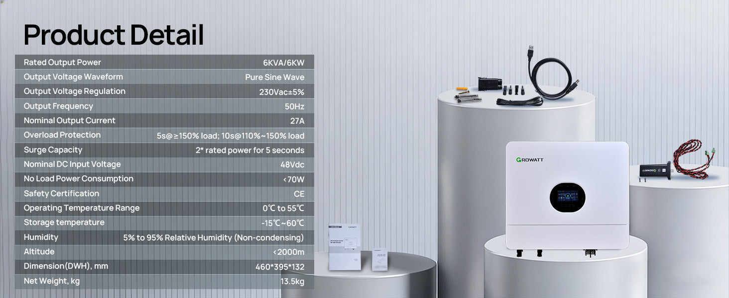 | Rated pover: 6000VA/6000W | Parallel capability: Yes,6 units maximwm |