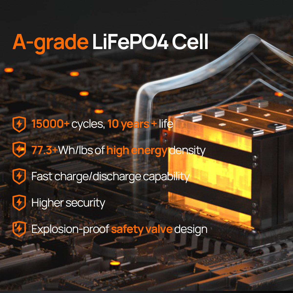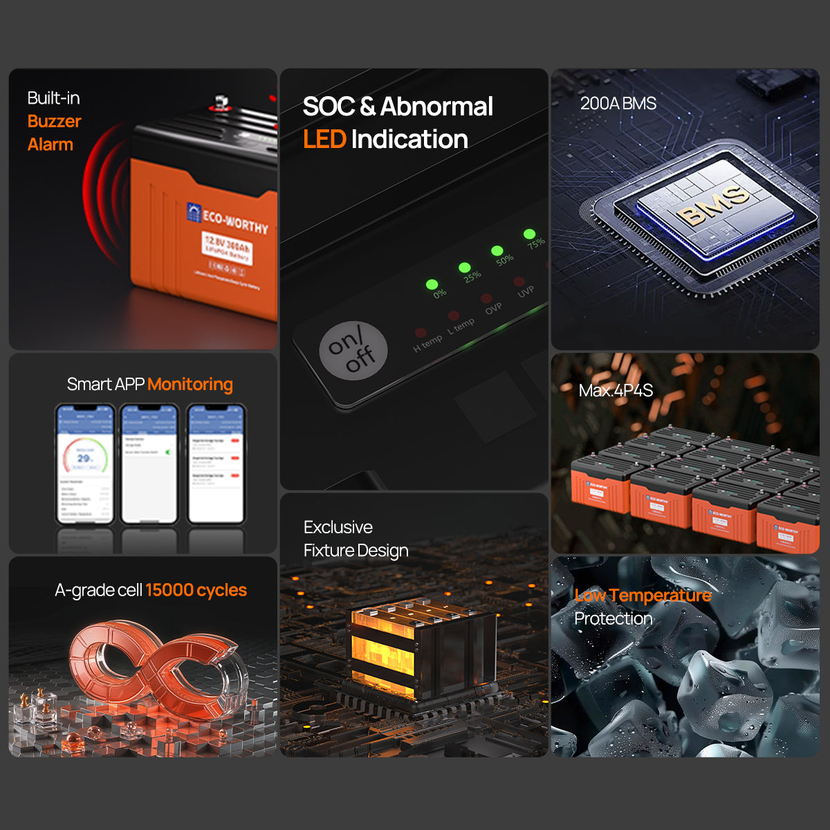 [Grade A Cells & 200A BMS] : Utilizes Grade A battery cells and a robust 200A BMS with comprehensive protection mechanisms against high/low temperatures (automatically disconnects charging when the cell temperature falls below 19.4°F) , voltage fluctuations, and overloads; It also boasts an long lifespan of up to 15000 deep cycles